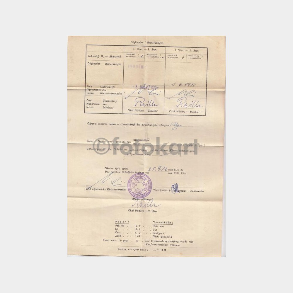 1972 Avusturya Lisesi Sankt Georg Öğrenci Karnesi