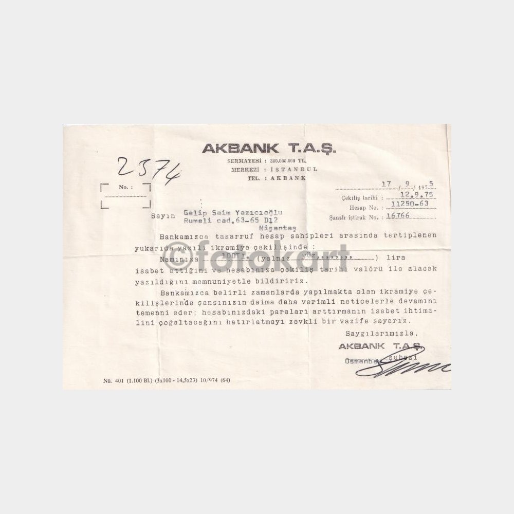 1974 Akbank Mudi İkramiye Çekilişi İsabet Etmesi Konulu Yazısı