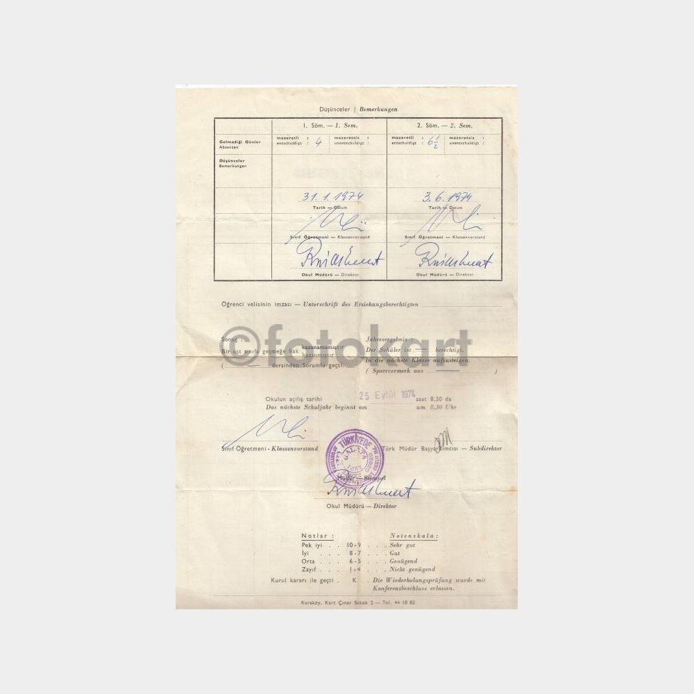 1974 Avusturya Lisesi Sankt Georg Öğrenci Karnesi