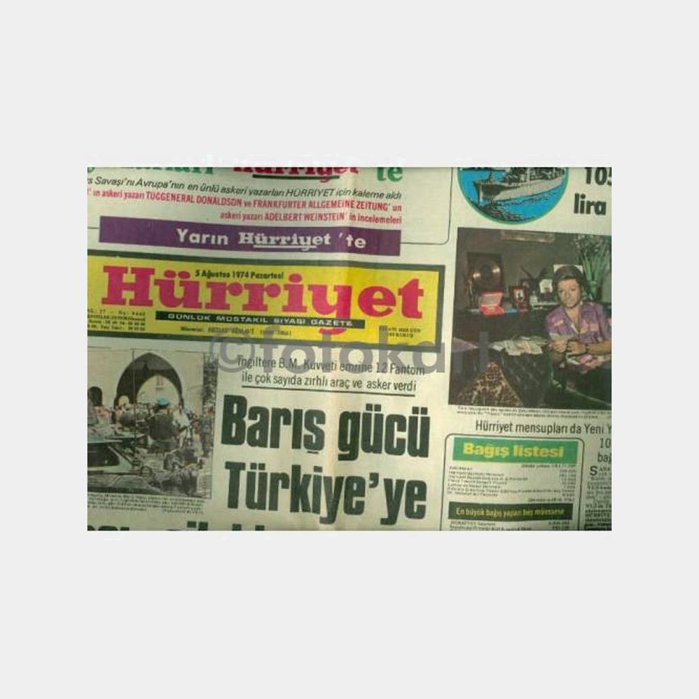 Kıbrıs harekatı ile ilgili haber ve resimler bulunan çok temiz kalmış Hürriyet Gazetesi. 5 Ağustos 1974.