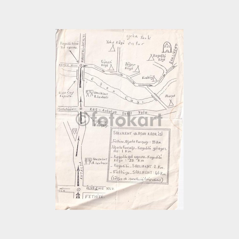 1980 Fethiye Saklıkent Yol Haritası Çizim Baskı