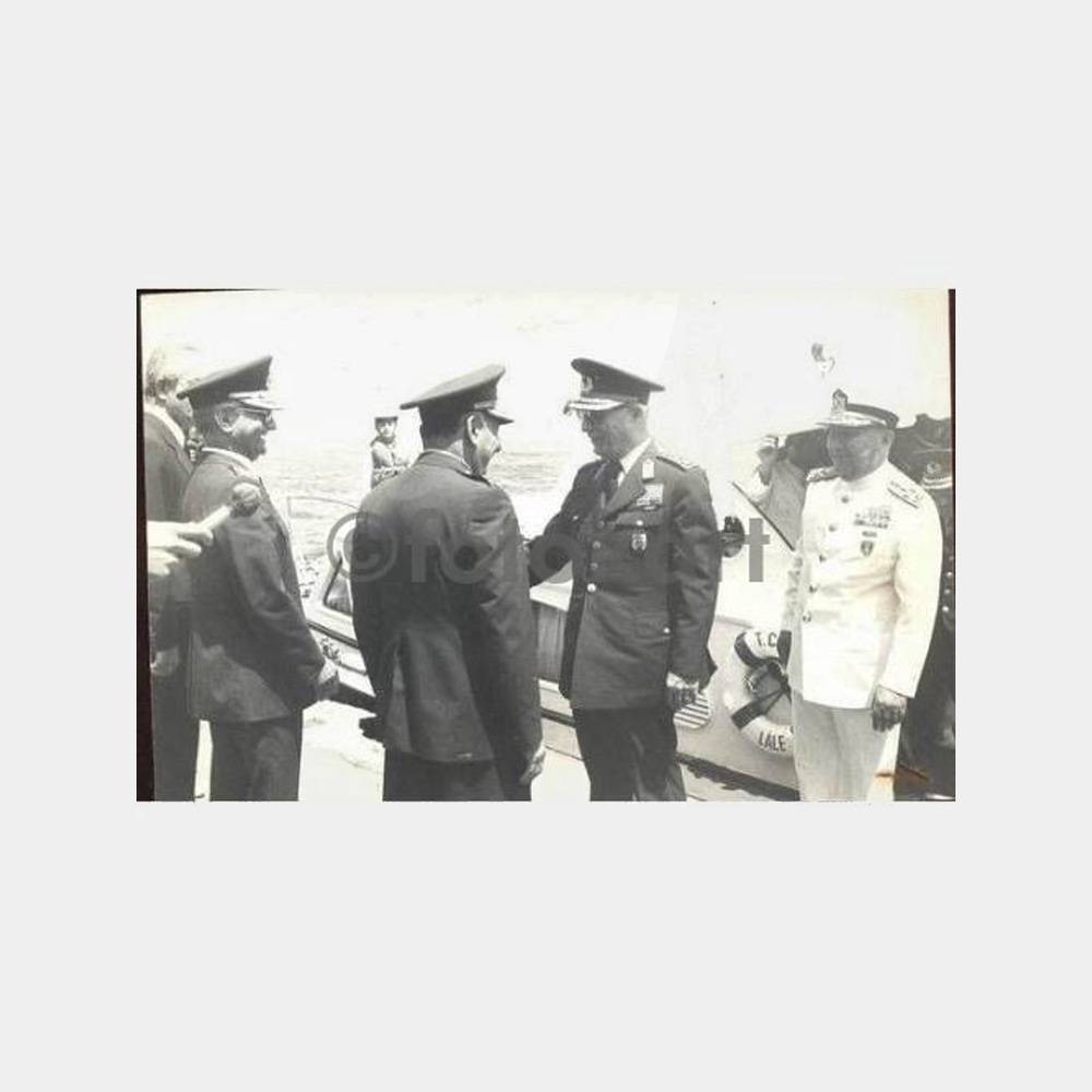 1981 kuvvet komutanları tcg Lale gemisinden, 17. 5 x 12 cm ebadında-org. Kenan Evren,,Tahsin Şahinkaya,Nurettin Ersin ve deniz kuv. Komutanı tcg lale botundan savaş gemisindeki kabul esnasındaki görüntü,bir tatbikat sırasında olabilir-resmin üzerinde önemsiz bir sıyrık var. Arkası boş