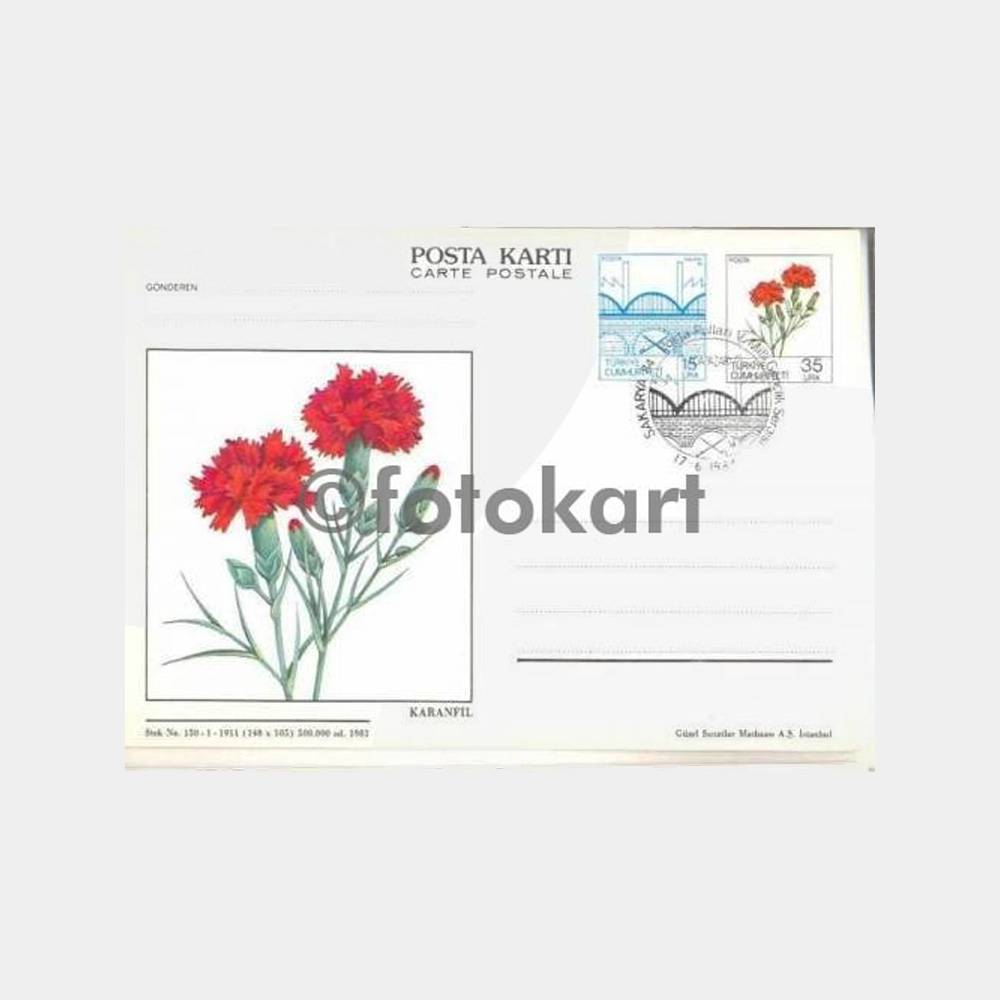 1983 çiçek resimli posta kartı, karanfil, kullanılmamış çok temiz Sakarya pul sergisi baskılı ve ilk gün damgalı 17. 06. 1984 tarihli