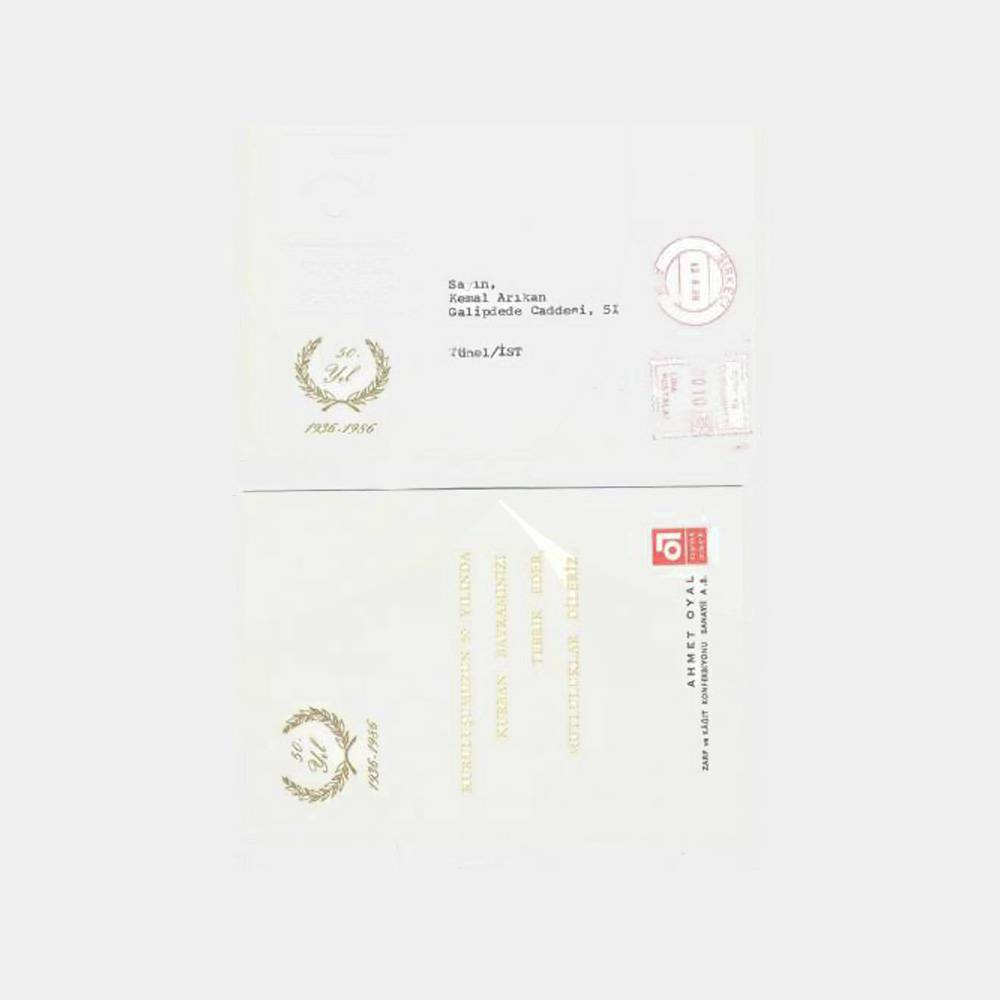 Kabartma oyal markası ve 50. Yıl çelenk baskılı, içinde Ahmet Oyal baskılı kutlama yazısı var