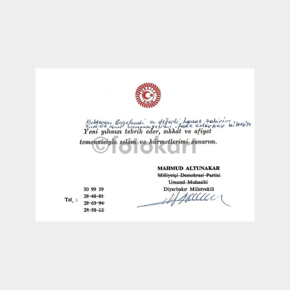 “1988 Diyarbakır Milletvekili Mahmud Altunakar Tebrik Kartı” için yorum yapan ilk kişi siz olun