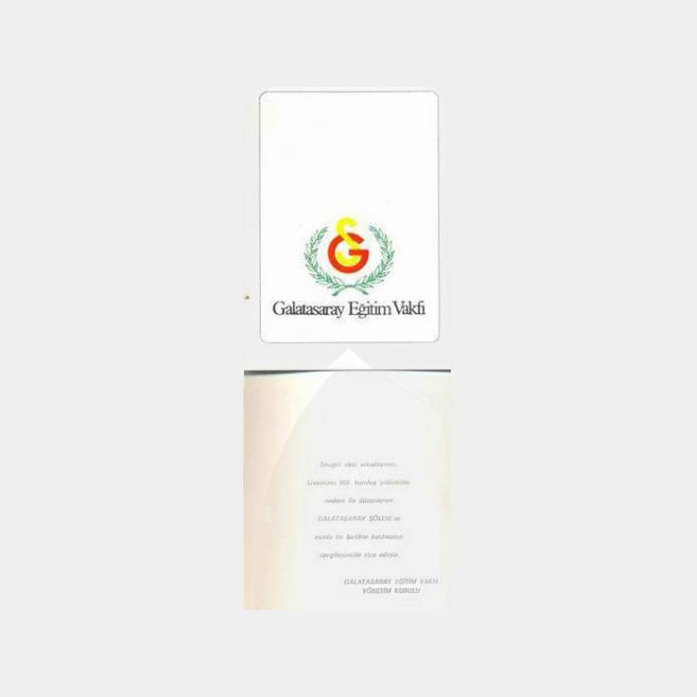 1990 Galatasaray vakıf 2 adet davetiye 02. 12. 1990 tarihinde Galatasaray Eğitim Vakfı yönetim kurulu başkanı sayın inan kıraç ve eşi, lisemizin 509. yılı ve 50 yıllık mezunlar berat ve madalya töreni ile ayrıca şölen davetiyesi