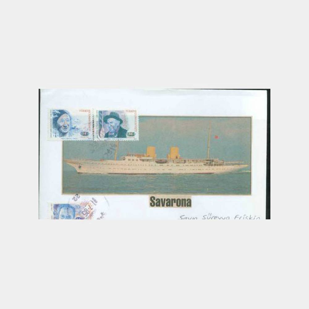 Bir zarf üzerinde yapışmış,  Savarona yatı,  resimli,  pullu ve adresi ile postadan geçmiş 1. 7. 1995 tarihli Şişli damgalı