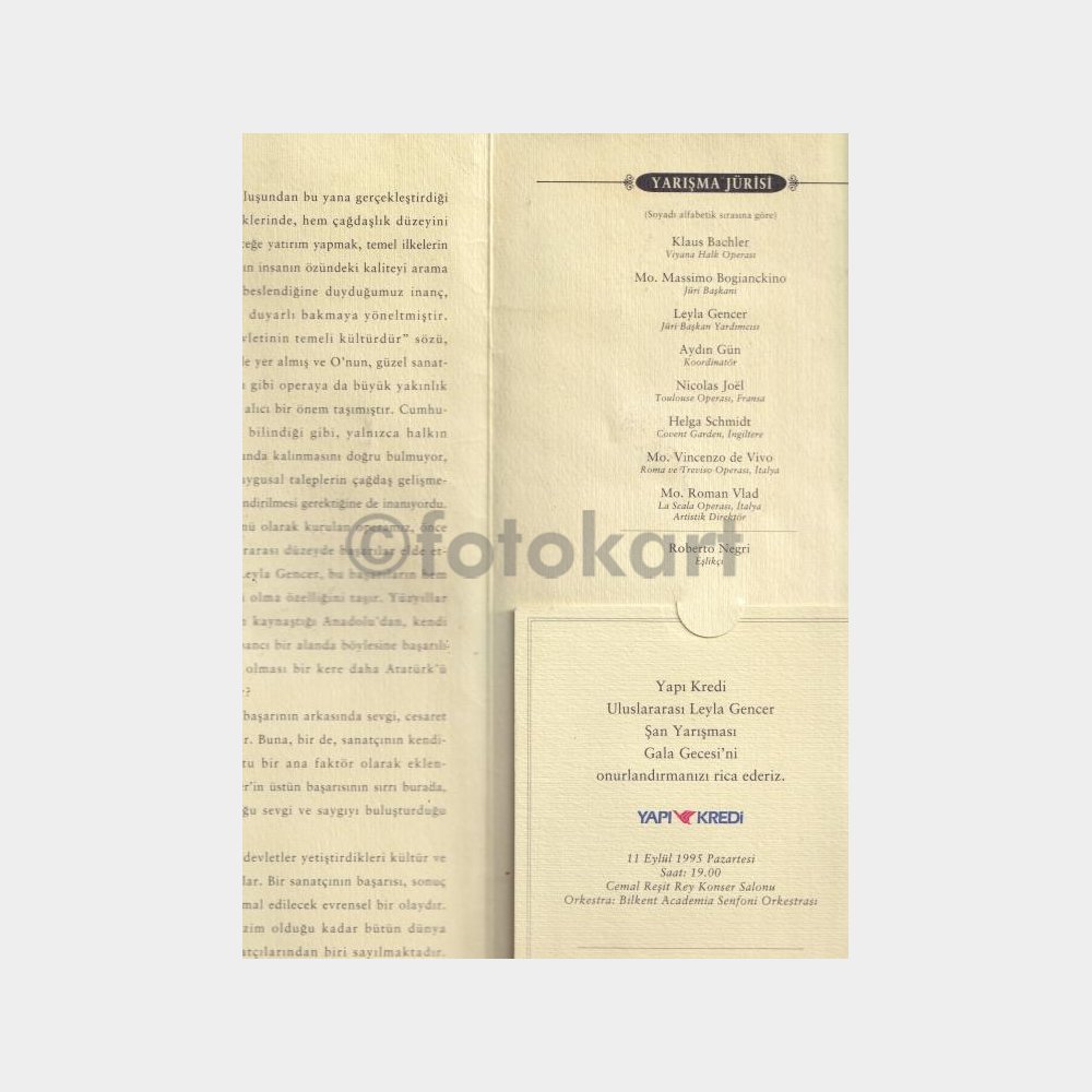 1995 Yapı Kredi Leyla Gencer Şan Yarışması Davetiyesi (Büyük Boy)