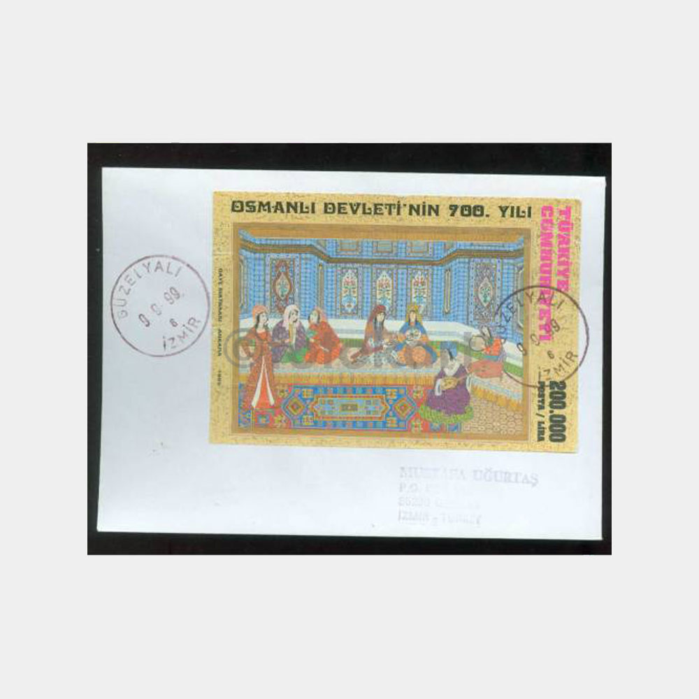 Çok temiz özel tarih damgası İzmir’in kurtuluşu nedeniyle sadece 9 rakamlarından oluşan 09.09.1999 tarihi taşıyan ve osmanlı blok pul üzerinde tatbik edilen zarf Adresli ve arka kısmında varış tarihi 10.09.1999 Güzelyalı damgası da var
