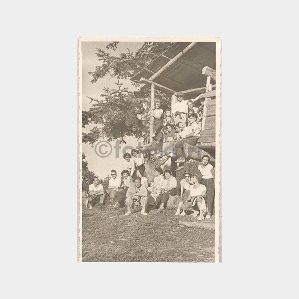 Köy evi üzerinde çekilen kalabalık bir grup.