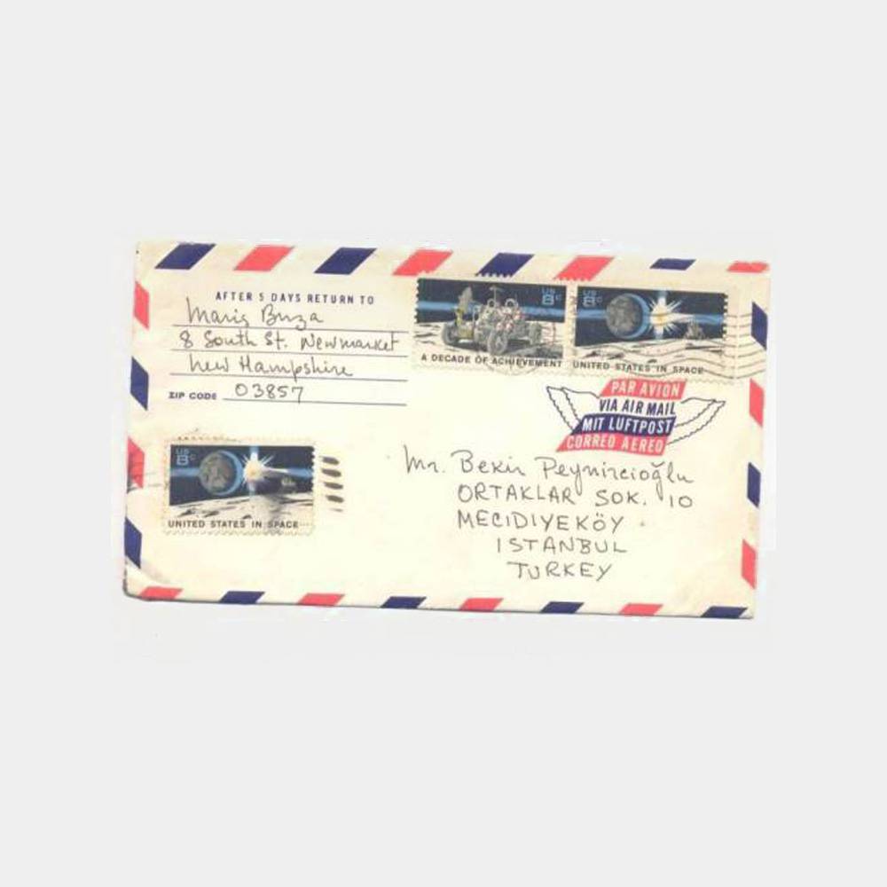 Üzerinde üç adet ay , uzaya yolculuk konulu damgalı zarf