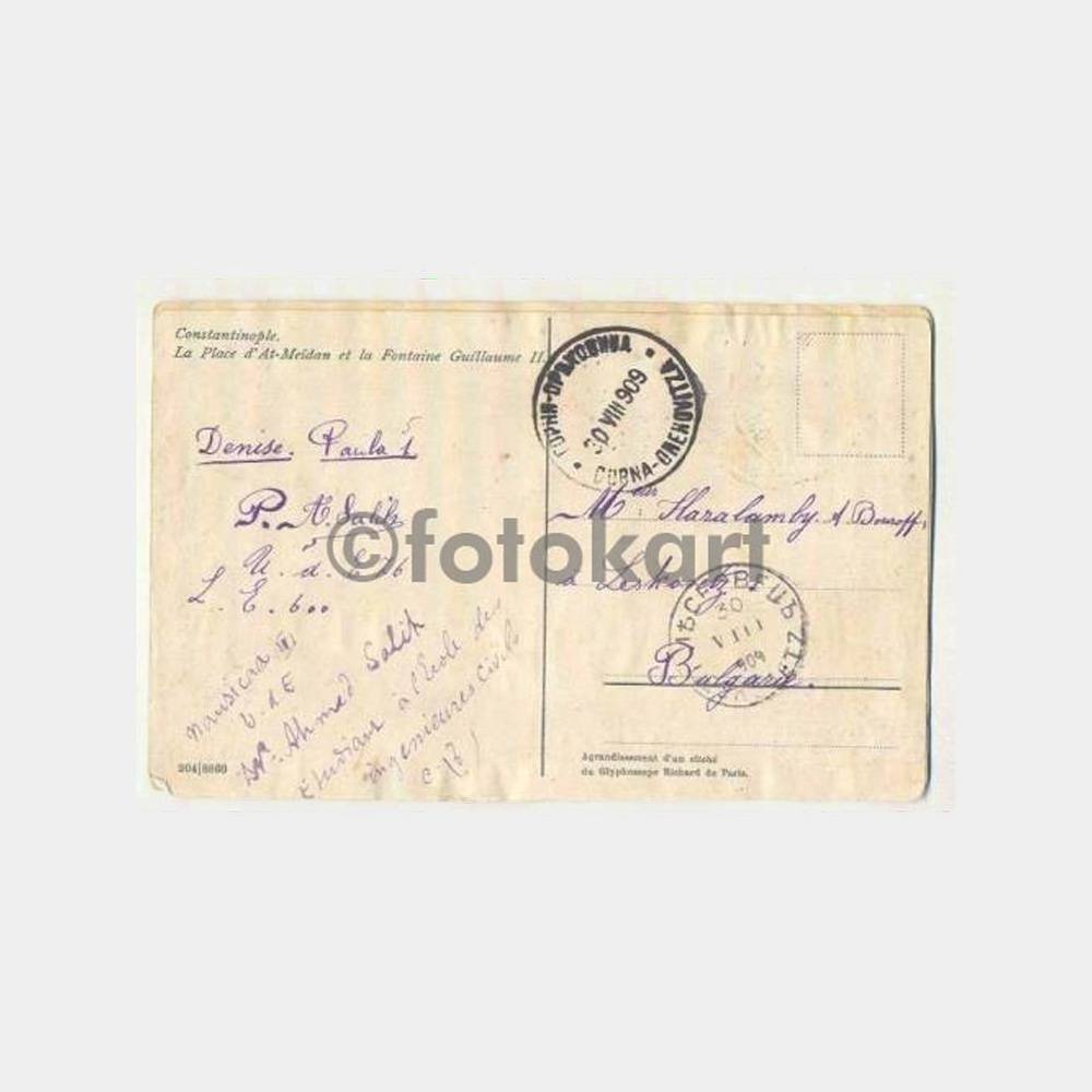 Arka yüzünde Ahmet Salih tarafından mühendislik okulu ecole des ingenieures civils, tarafından Bulgaristan’a gönderilmiş 30. 08. 1909 curna, onenovitza damgalı ve 30. 8. 1909 leskovets damgalı, ön yüzü Osmanlı pul damgalı