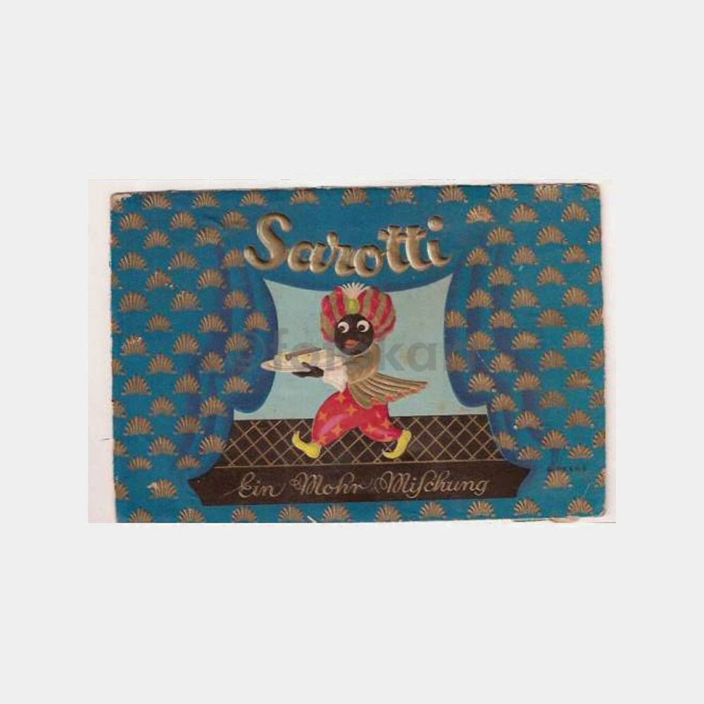 Sarotti, ein mohr mifchung. Baskılı kart, Almanya’nın en eski ve ünlü şekerleme firması, 1852 de kurulmuş. Kutu kapağı 1930’lı yıllara ait, 15 x 20 cm ebadında.