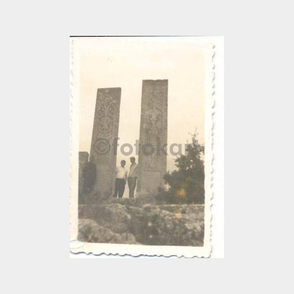 6 x 9 cm ebadında, arkası yazısız iki uzun taş abide önünde.