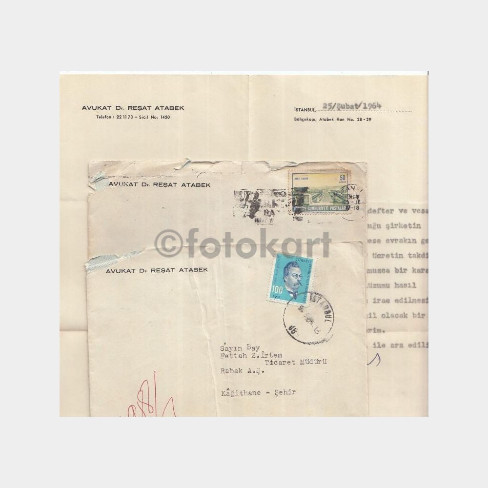 8 x 12 cm ebadında, koleksiyon amaçlı eski 2 adet zarf, bir imzalı dava mektubu.
