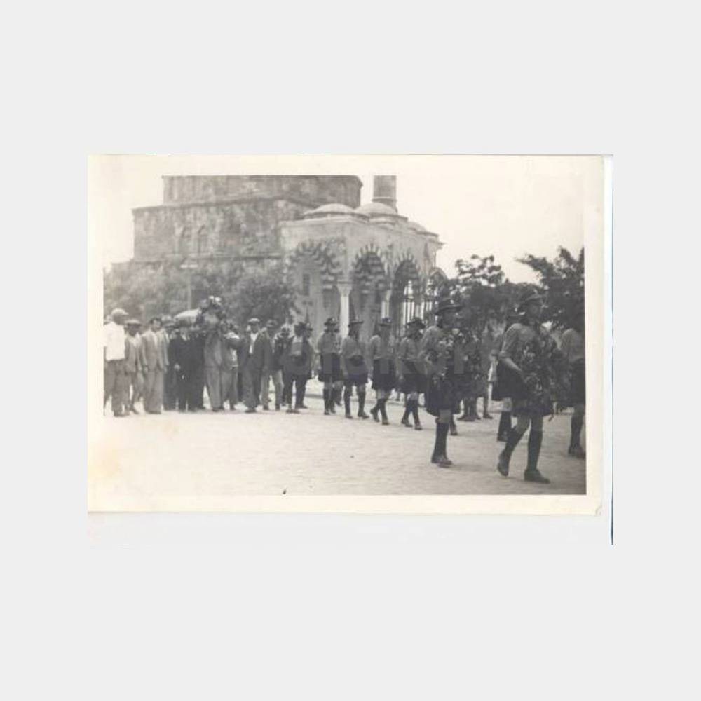 1930 lı yıllar, arkası yazısız, önde izci grubu yürüyüşü, 13 x 9 cm