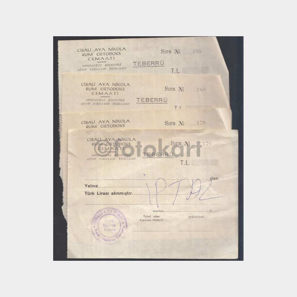8 x 12 cm ebadında koleksiyon amaçlı. Eski 4 adet iptal edilmiş makbuz.