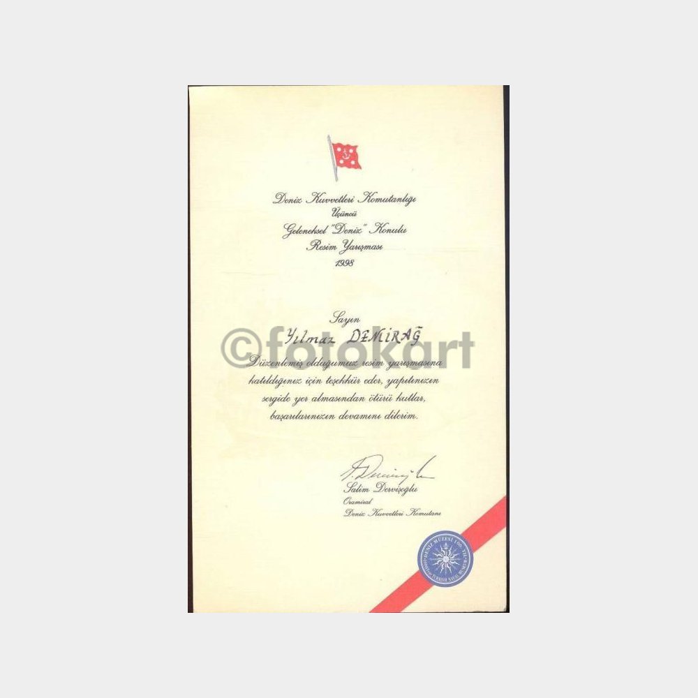 16 x 28 cm ebadında. 1998 tarihli -Üçüncü Geleneksel Deniz Konulu Resim Yarışması teşekkür belgesi, Deniz Kuvvetleri Komutanı Oramiral Salim Dervişoğlu orjinal imzalı.