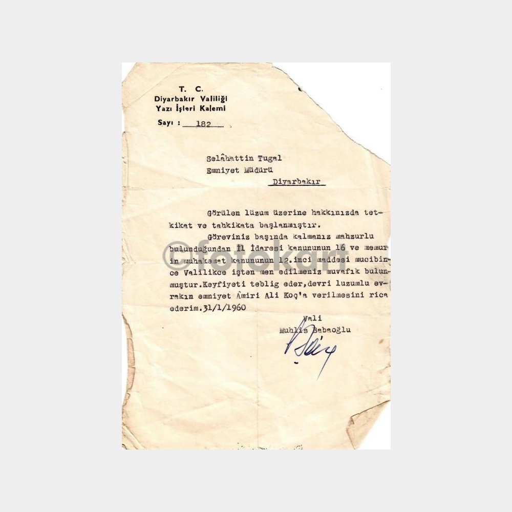 Diyarbakır Valisi Muhlis Babaoğlu İmzalı Tebrik Kağıdı