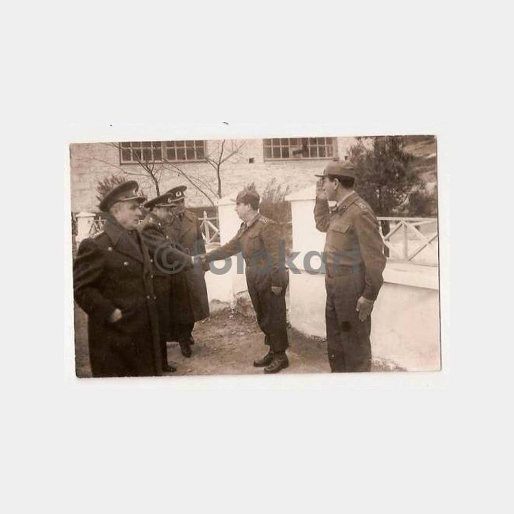 Fotoğrafın arkası Tugay Foto Edremit Balıkesir kaşeli. Askerler karşılama sırasında. 1963.