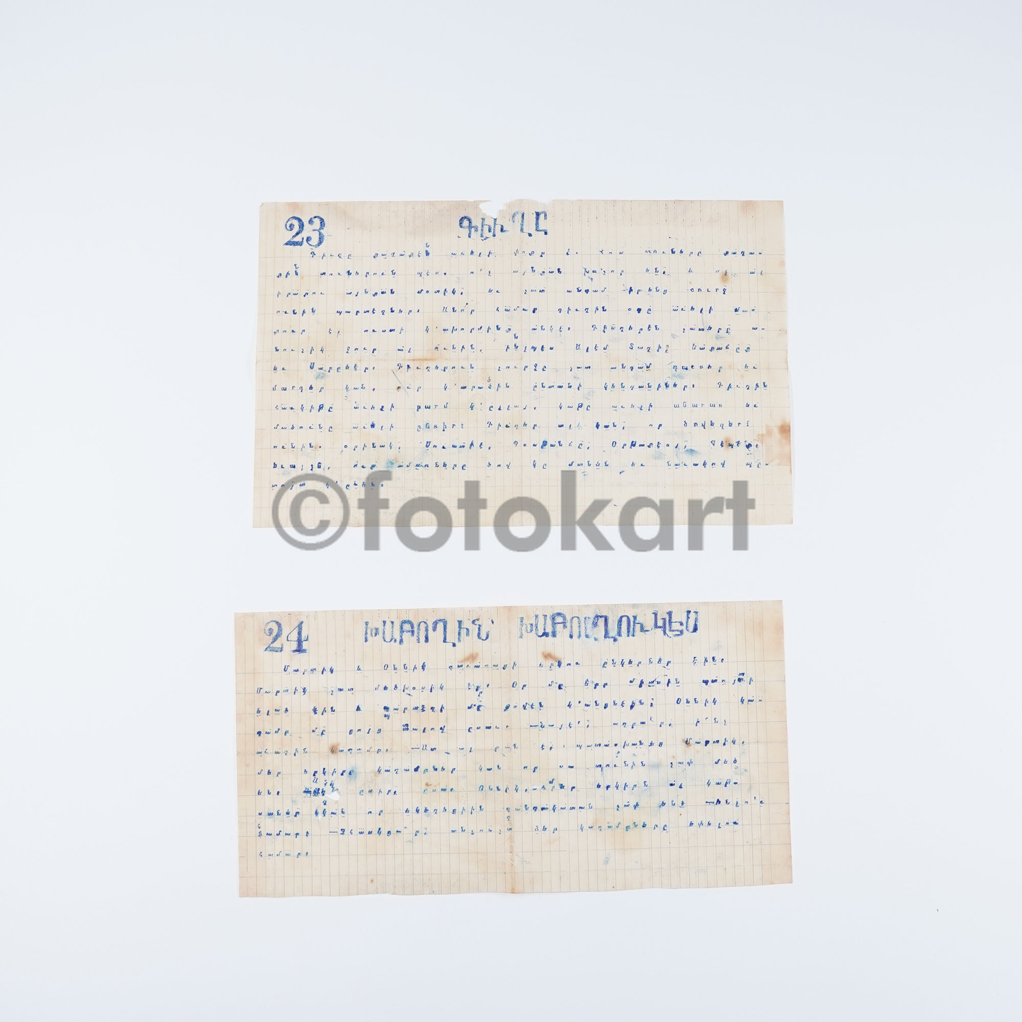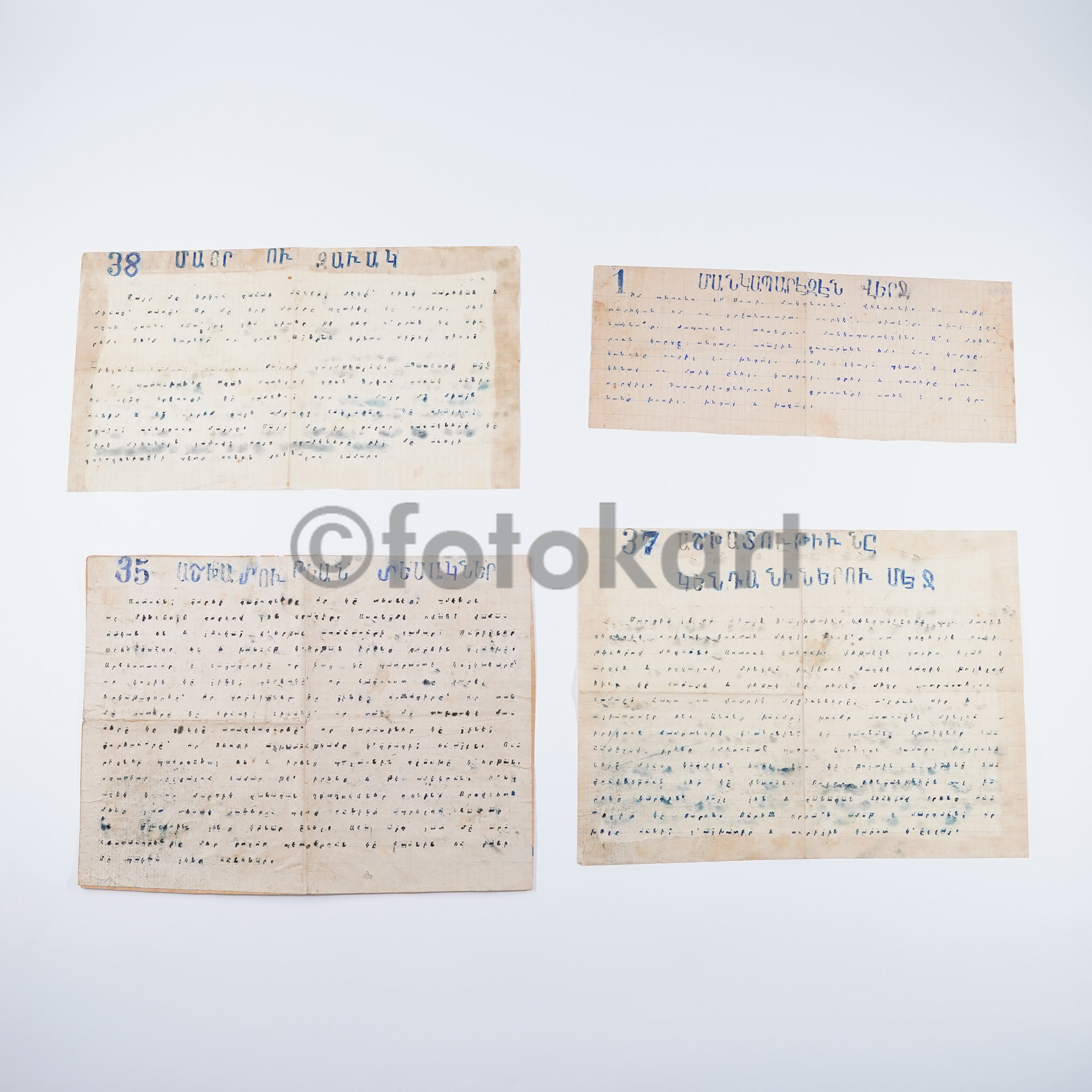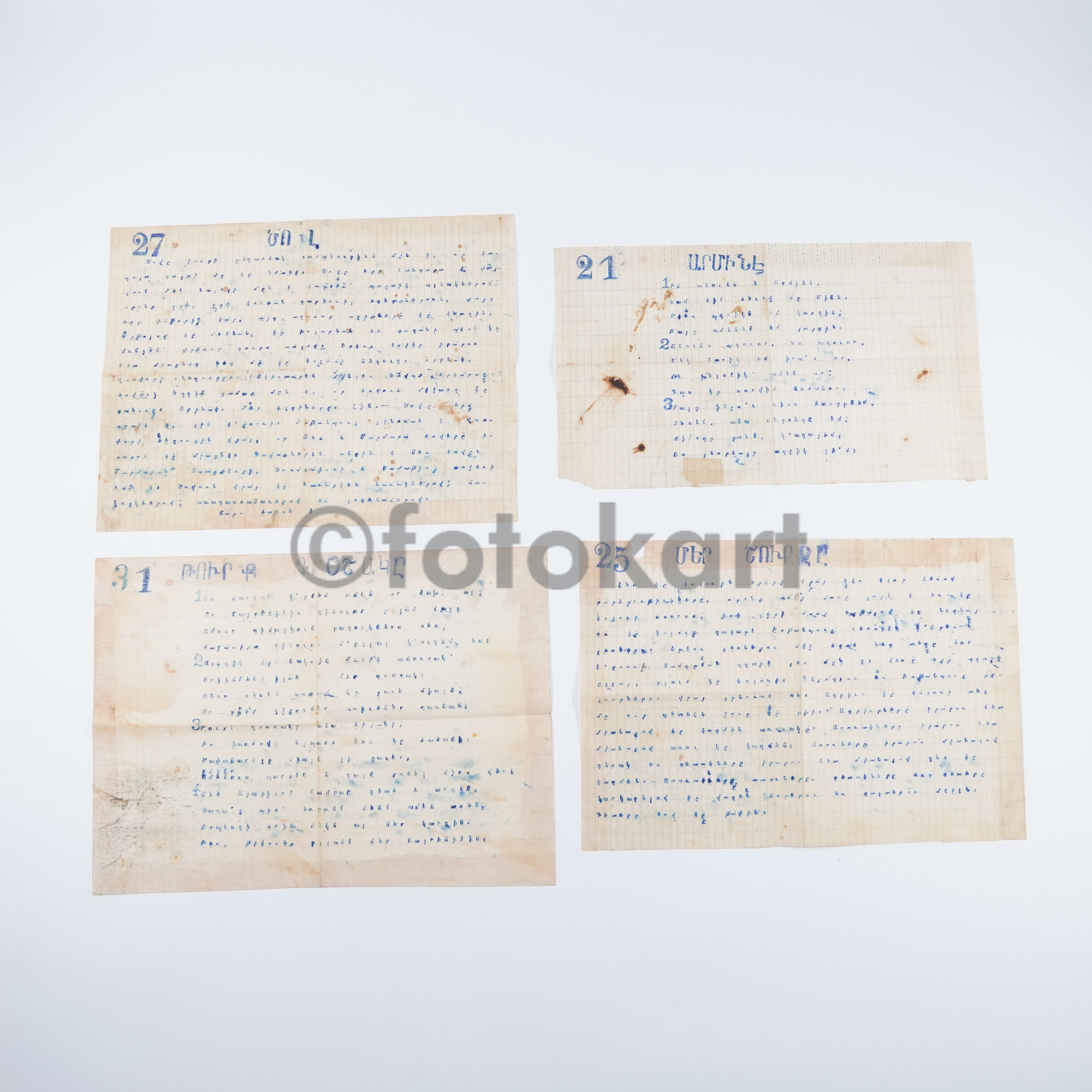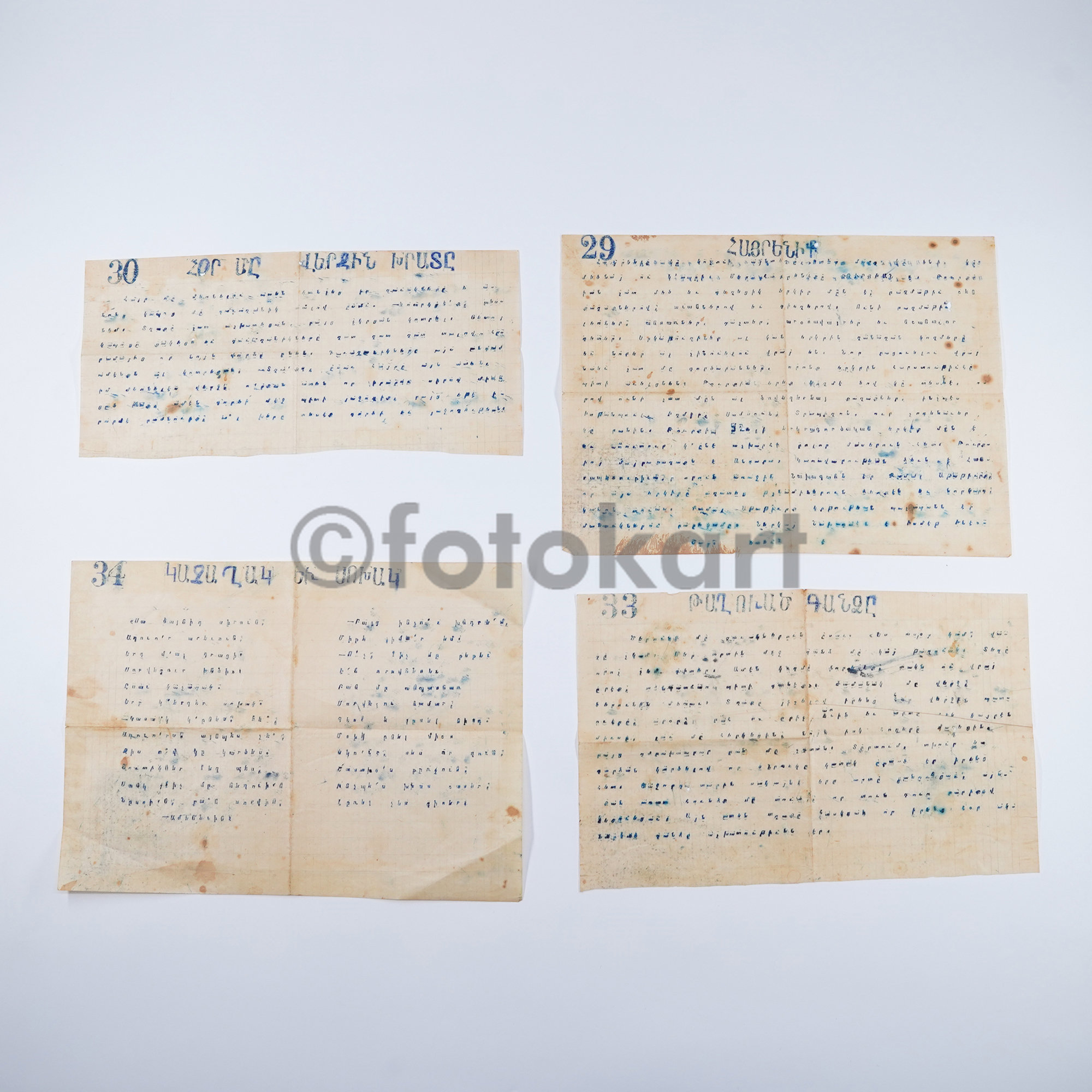 Her biri yaklaşık 15×24 cm. El yazılı, dini bir lot içinden çıkma. Muhtemelen bir dil veya yazı alıştırması amaçlı olabilir. 100-150 yıllık. (Önlü arkalı 9 adet föy olarak iletilecektir.) Değerli tarihi belge.