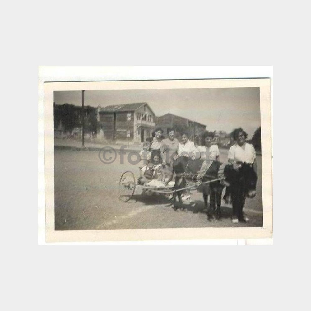 6 x 9 cm ebadında- Eşeğe bağlanmış ve çocukları taşıyan bir araba-şehirde bir cadde üzerinde eski konaklar- arkası yazısız.