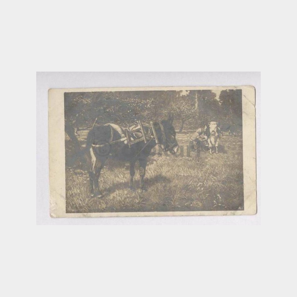 9 x 14 cm ebadında, arkası yazısız. Arka planda inek sağan bir kadın görüntüsü var.