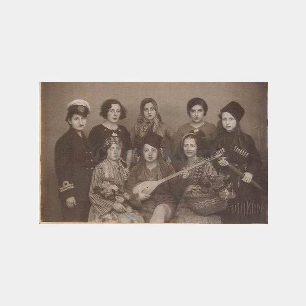 Foto moda çok ilginç bayanlar topluluğu, 8 adet bayan hepsi değişik giysiler içinde,denizci,folklor,bağlama çalan,köylü kızı,kafkas kızı vs. albümden çıkma arkası boş. Albüm sayfasının kahverengi ile boyanmış