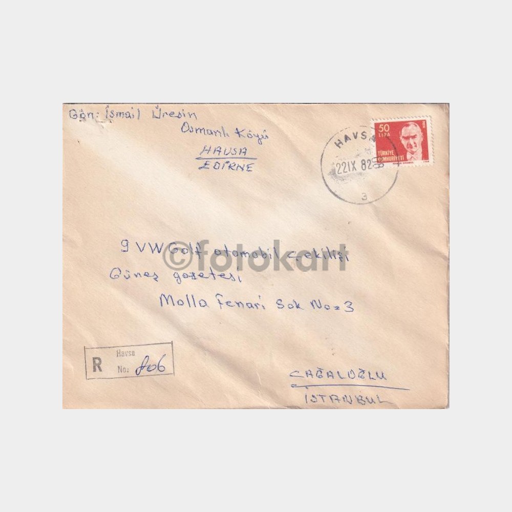 Havsa-Edirne, Posta Tarihi-Şehir Damgalı Zarf