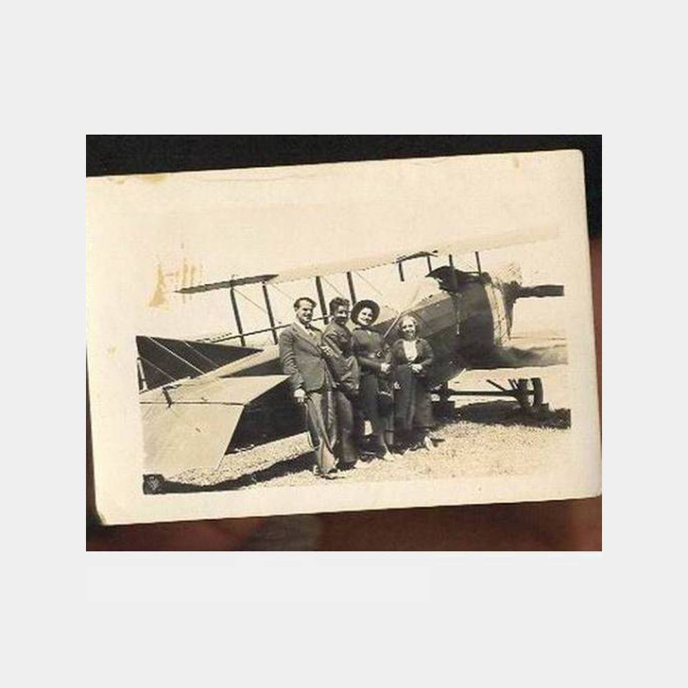 İlginç bir uçak önünde 4 kişi fotoğraf 9. 5 x 6. 5 ebadında küçük ebat foto, arkası boş