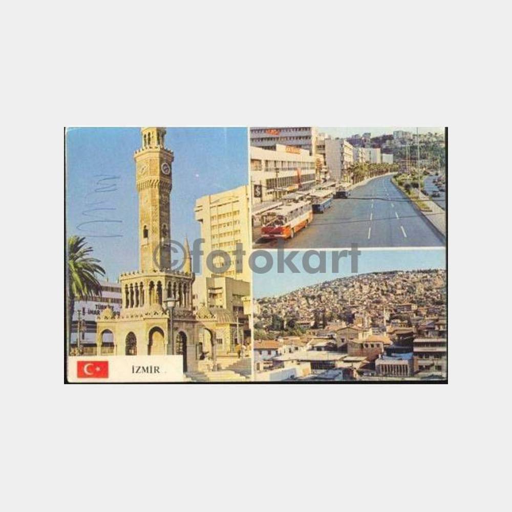 İzmir şehirden üç görünüş kartpostal, mavi otobüsler var, üzerinde hafif tükenmez çizgi var