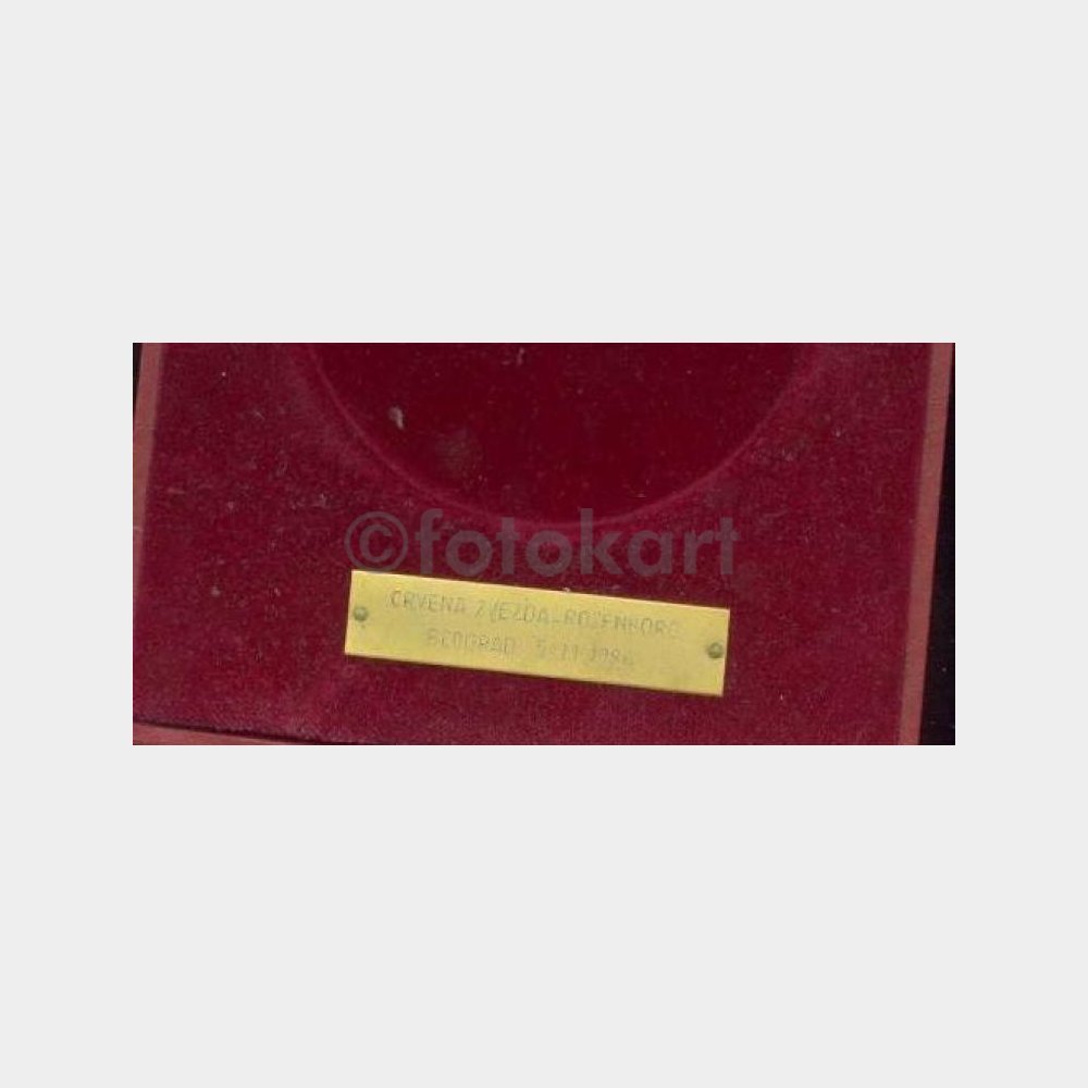 Yugoslavya’nın ünlü futbol kulübü Kızılyıldız’ın 10 cm çapında değerli ve kaliteli bir madalyası, 15 x 17 cm şık kırmızı deri bir kutu içinde, beograd 27. 09. 1989 plaket işlenmiş şekilde.