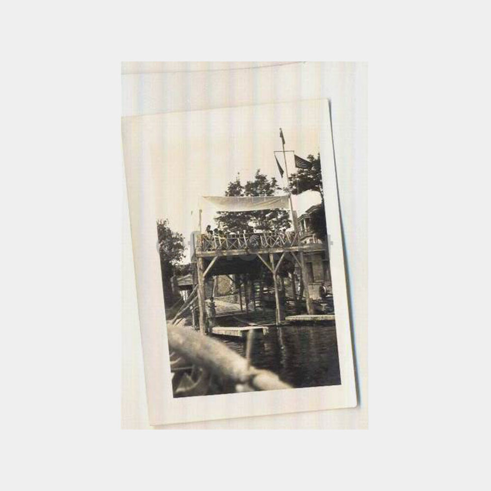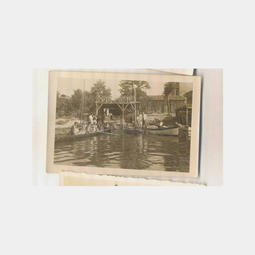 6 x 9 cm. 3 adet fotoğraf. Kürekçilerin yarışmaların izlendiği tahta bir stand var, alt kısmı iskele şeklinde üzerinde bayrak direğinde CHP altı ok bayrak görülüyor.