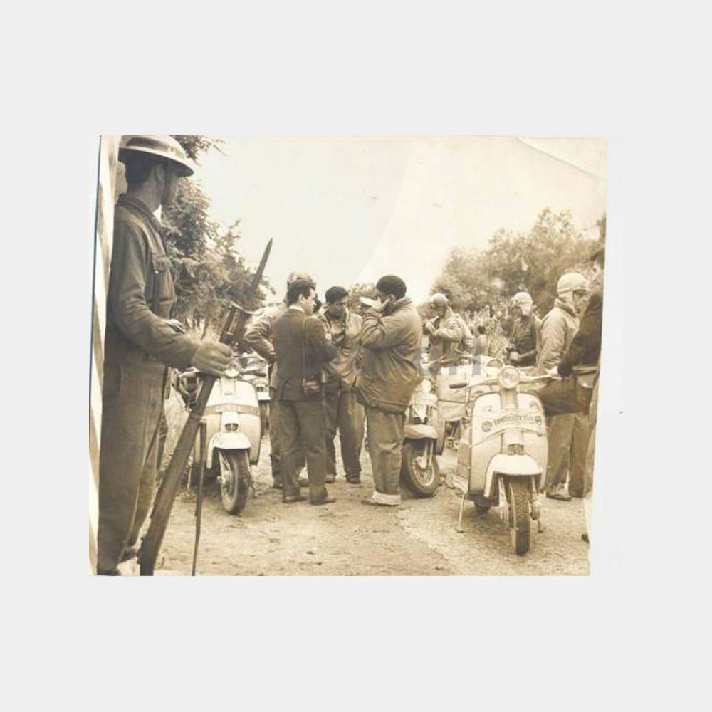 Arkasında 175 adet yabancı ülkelere aşt motorsiklet sevenler ” Vespa – Lambretist – Türkiye sınırında gazeteciler tarafından karşılandı” yazılı.