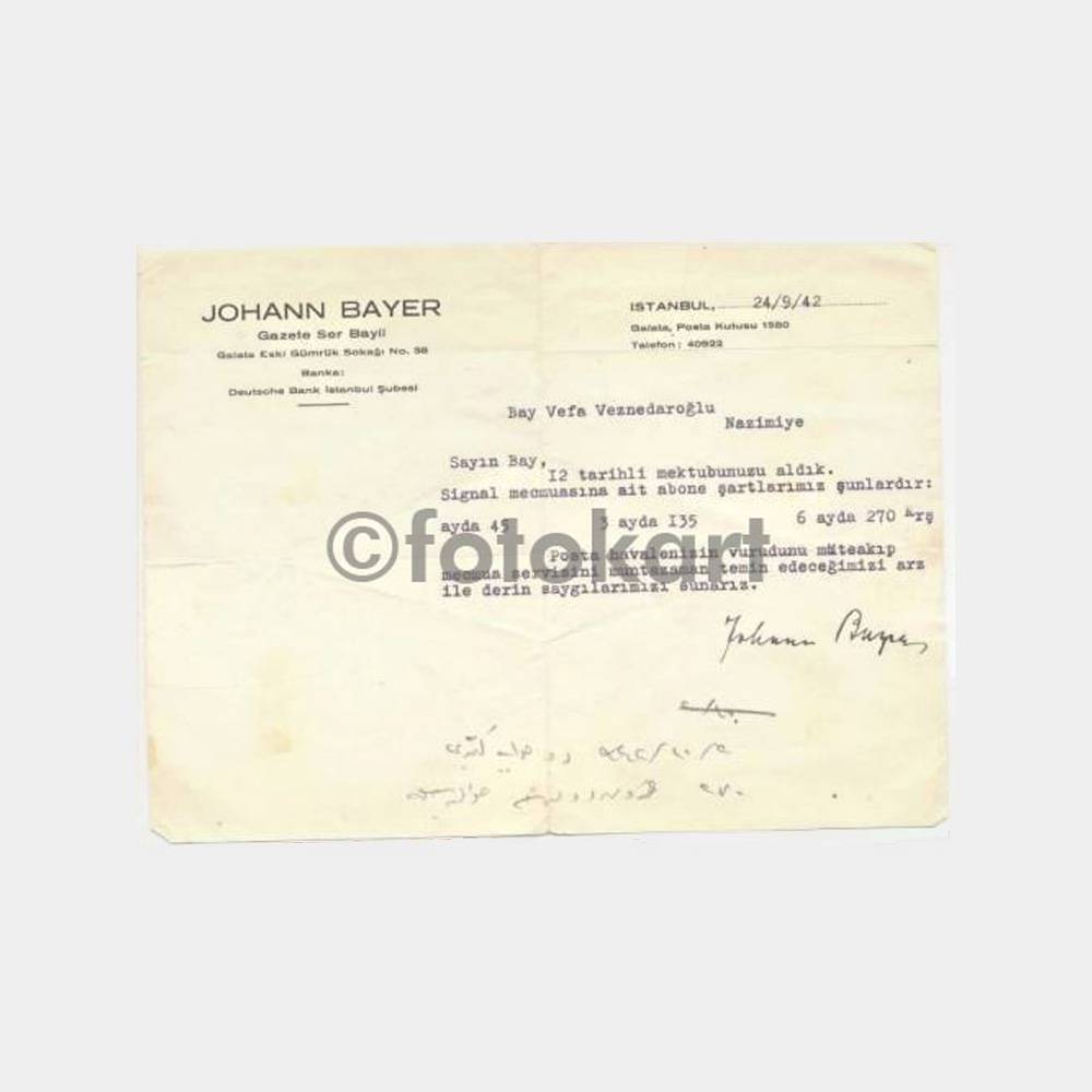 Johann Bayer,  gazete ser bayii, Galata gümrük sokağı n0. 38 24. 09. 1942 tarihli abone yazısı