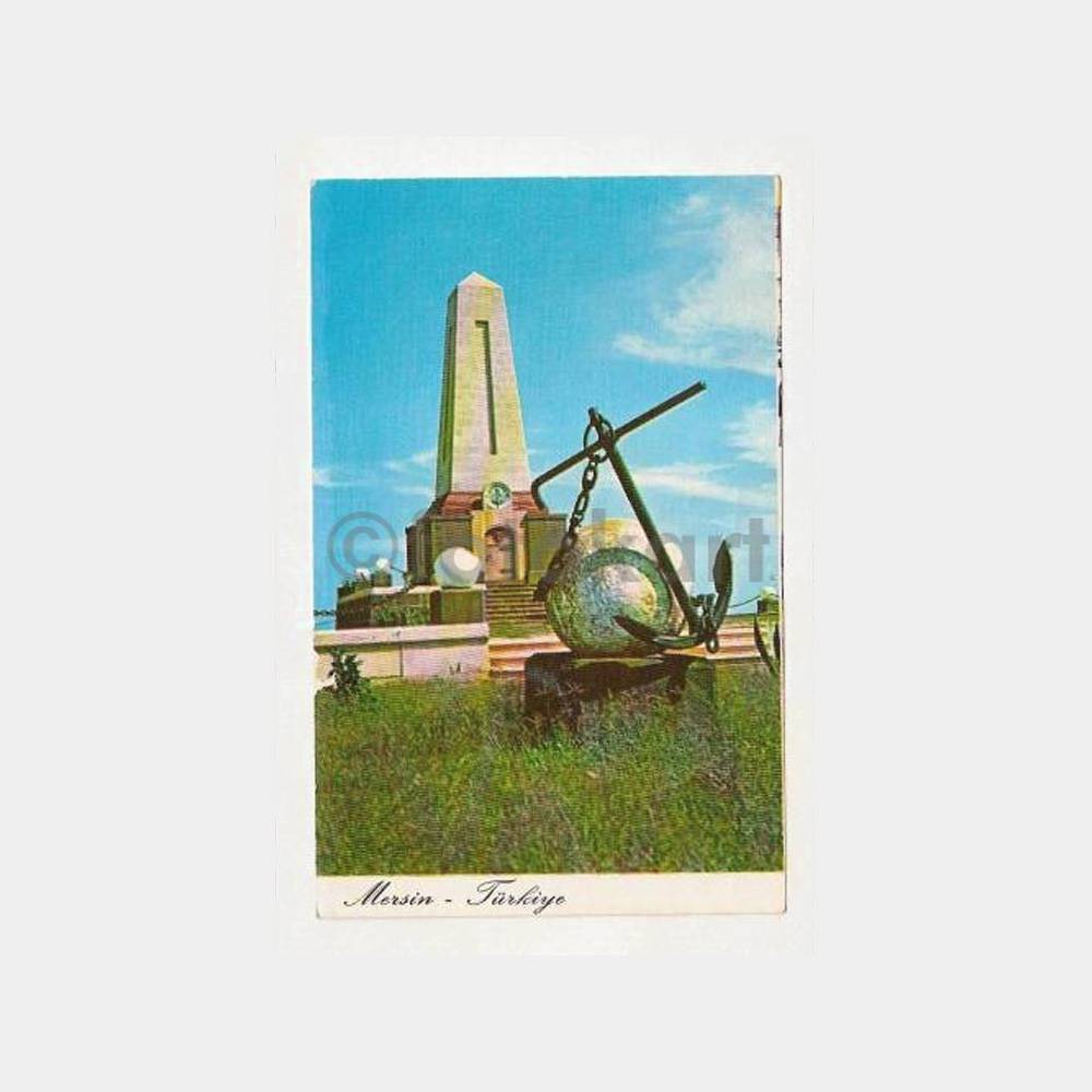 Arkası yazılı kartpostal, arkasında el yazısı ile mersin belediye gazinosundaki gazi amblemi ve anıtından görünüş yazılmış, ticaret kartları baskısı