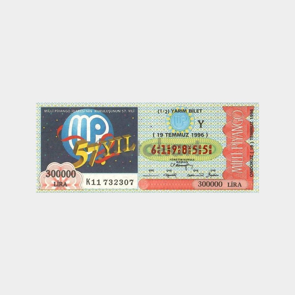 “Milli Piyango Bileti, 19.07.1996 Milli Piyango 57. Yıl Y-619855” için yorum yapan ilk kişi siz olun