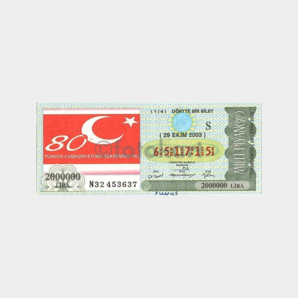 “Milli Piyango Bileti, 29.10.2003 Cumhuriyetin 80. Yılı S-651715” için yorum yapan ilk kişi siz olun
