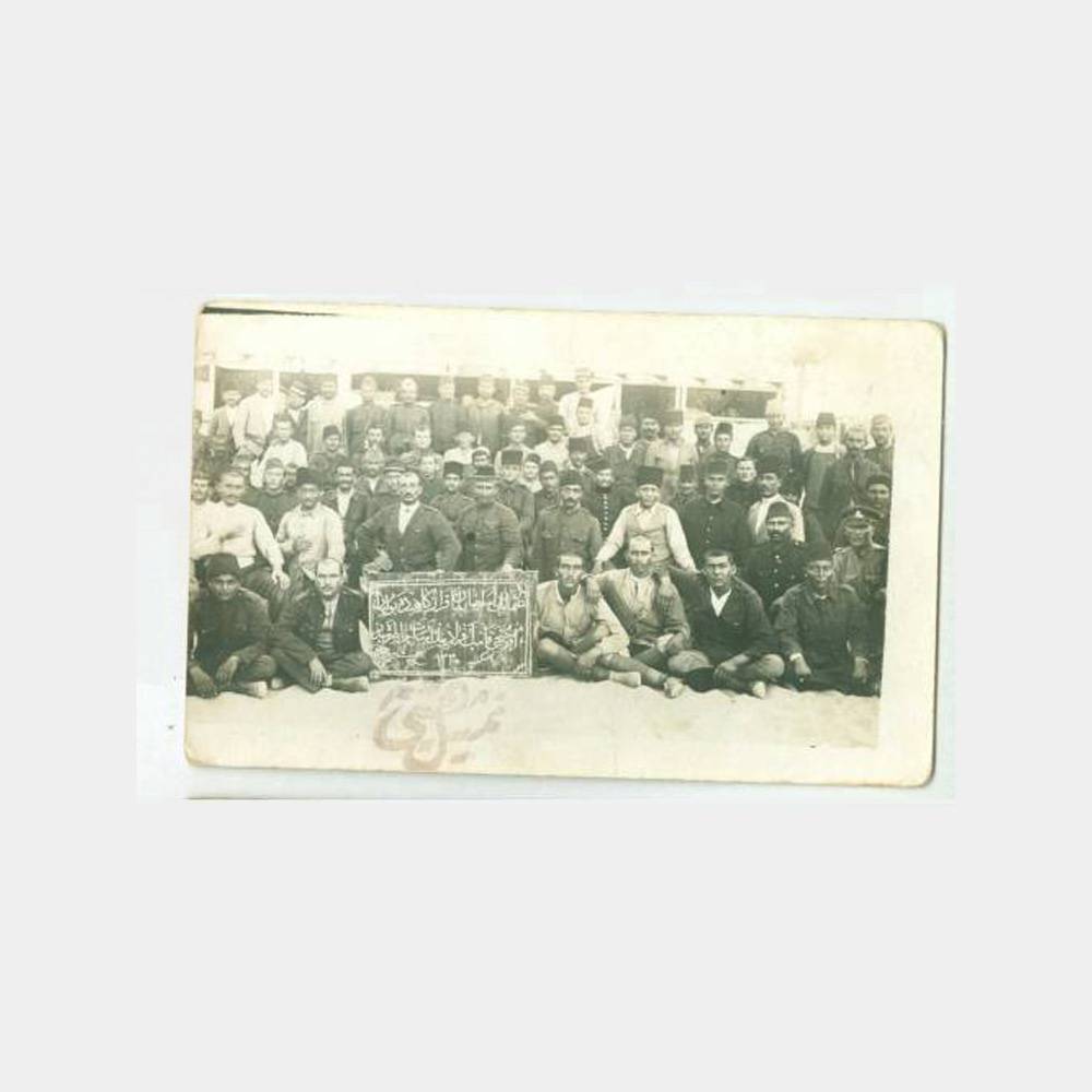 Levhada “Osmanlı üsera Zabitan Karargahında bulunan üçüncü kamp efradının esaret hatırasıdır, 1335 İskenderiye”