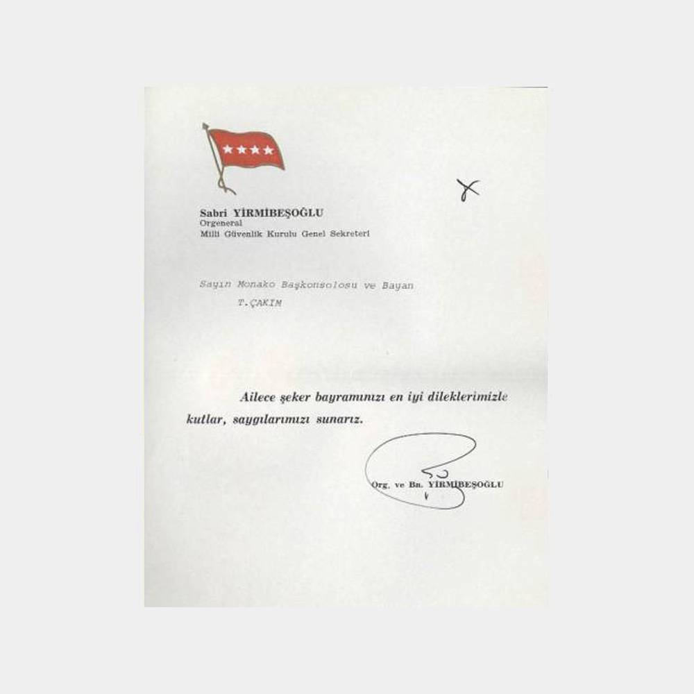Orgeneral Sabri Yirmibeşoğlu Tebrik Yazısı