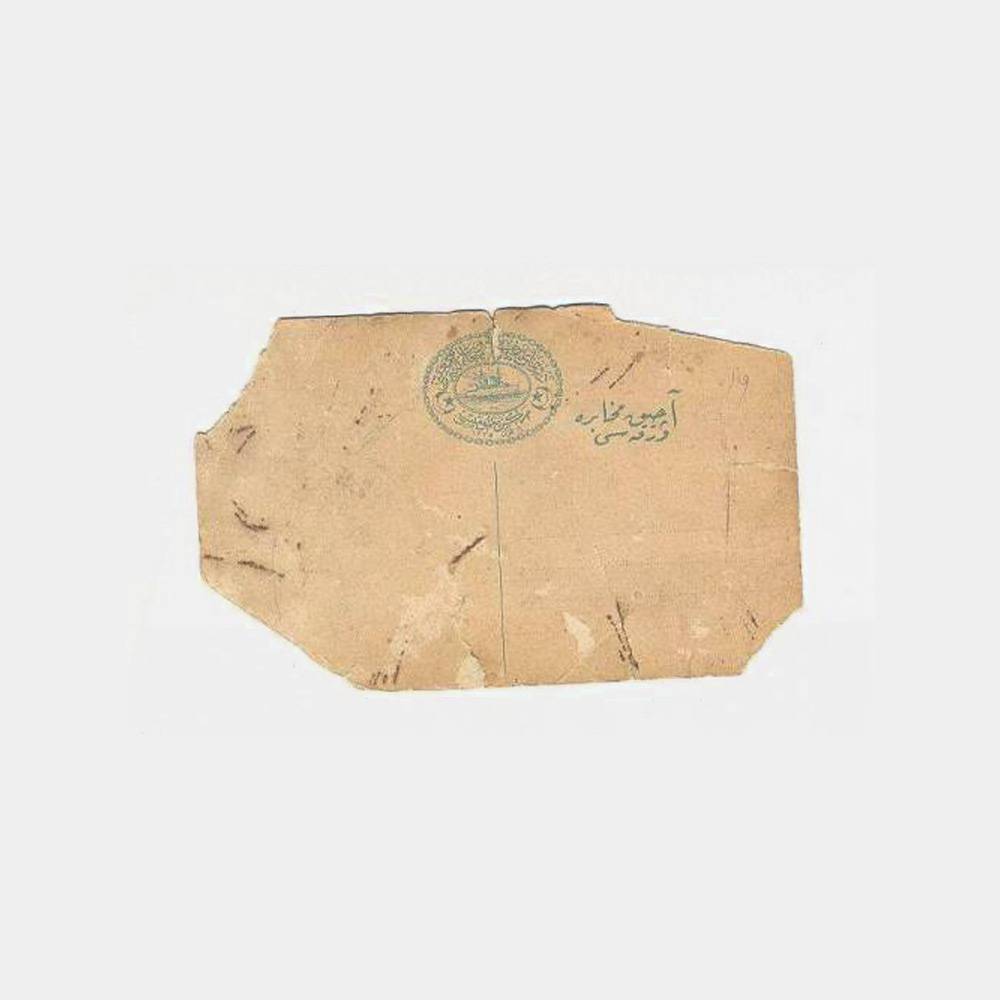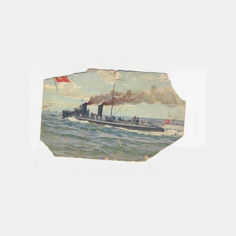 Kartpostal kondüsyonu çok zayıf haliyle, ancak belge nedeniyle sergilendi. Savaş gemisi değil ancak üzerinde küçük bir top bataryası var,