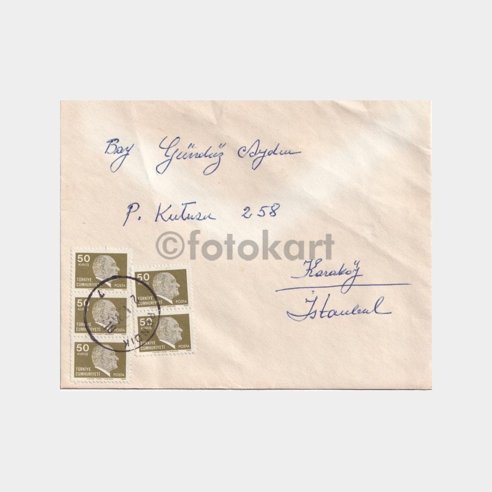 Pullu damgalı, postadan geçmiş, koleksiyon amaçlı zarf.