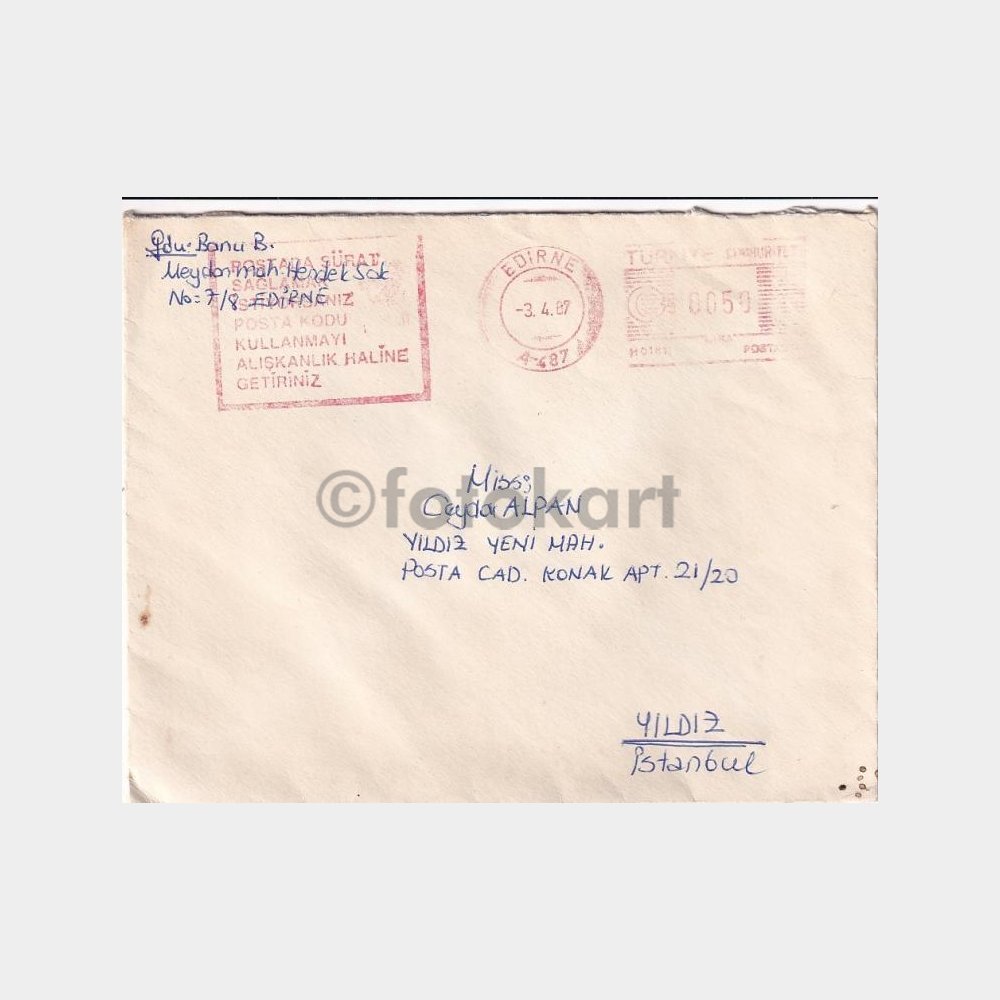 Postadan Geçmiş Zarf, 1987 Edirne Posta Kodu Flamlı