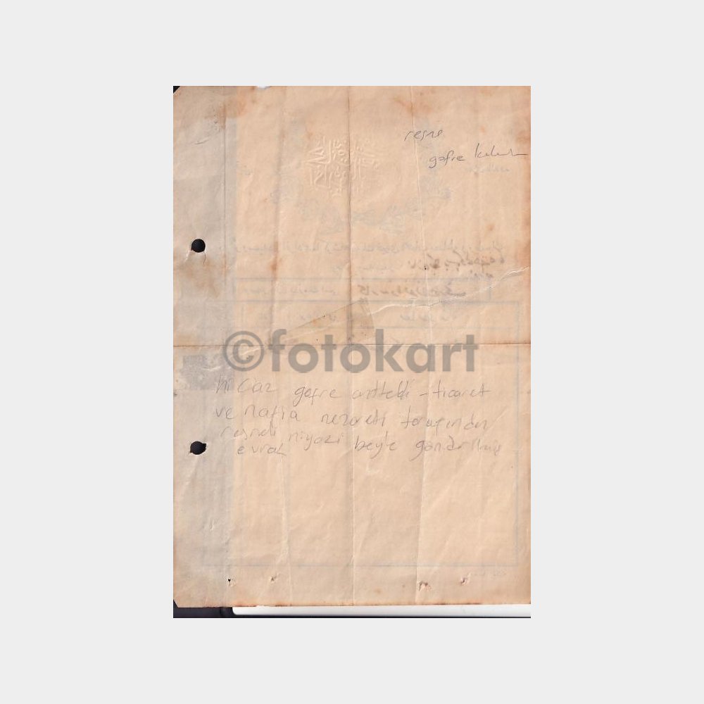 21 x 15 cm, antetli kağıt üzerine. Arkası bantlı. Önemli belge, araştırılacak.
