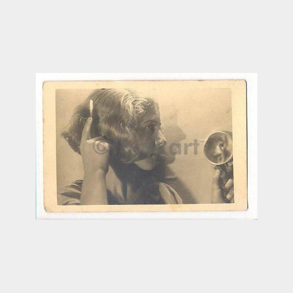 Arkası yazısız eski bir fotoğraf. Bir elinde ayna diğer elinde tarak-estetik bir fotoğraf.