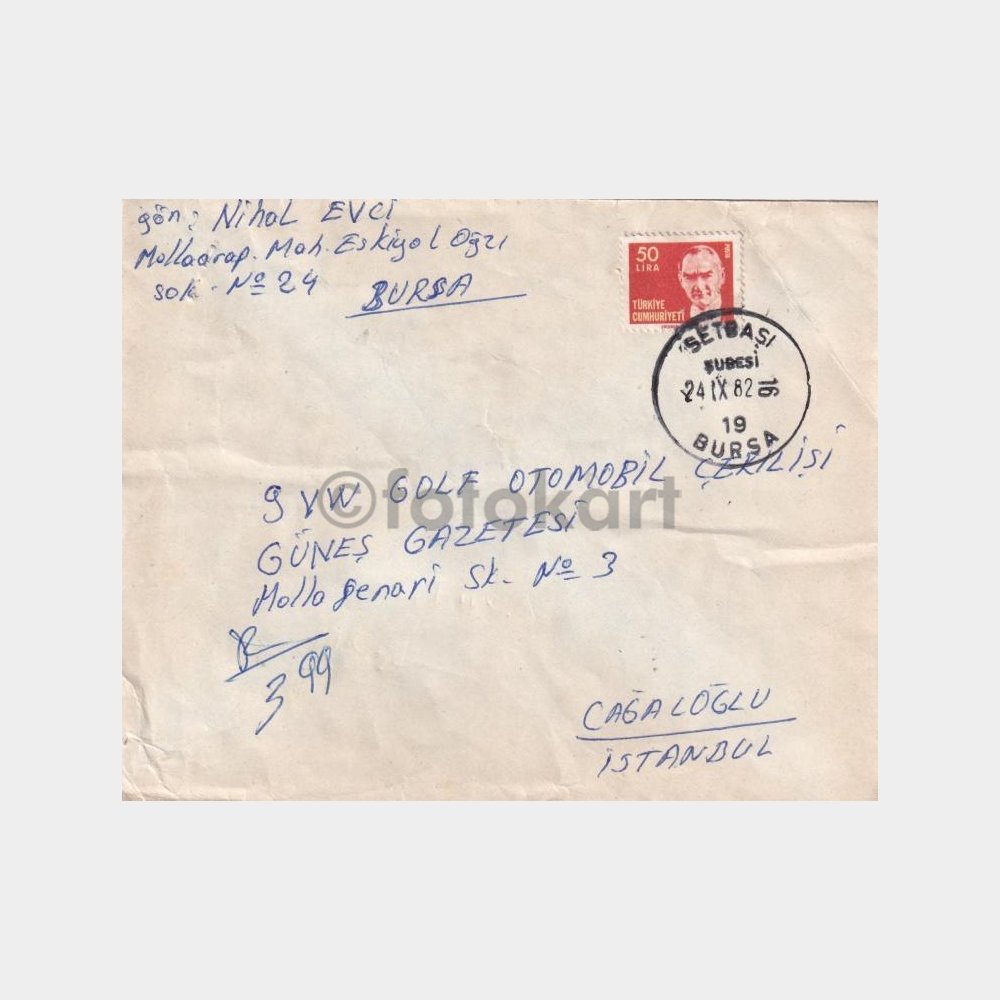 Setbaşı-Bursa, Posta Tarihi-Şehir Damgalı Zarf