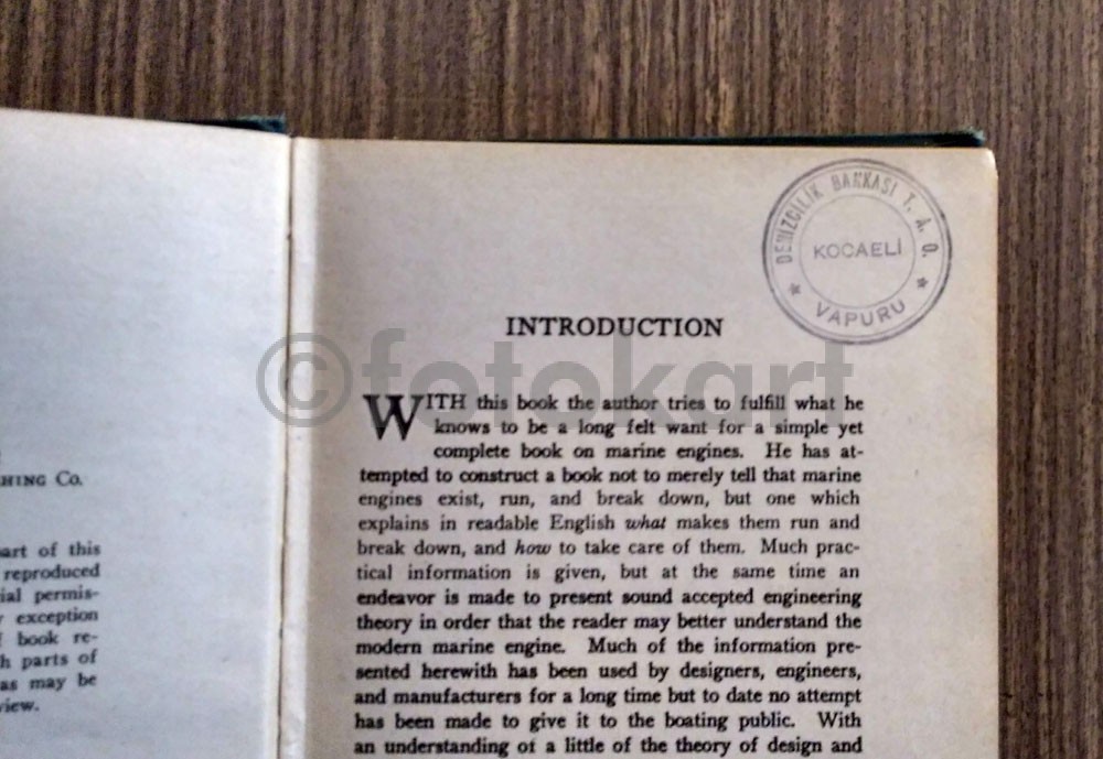 Gemi mühendisliği alanında İngilizce kitap. Üzerinde birçok yerinde Denizcilik Bankası Kocaeli Vapuru damgası var.