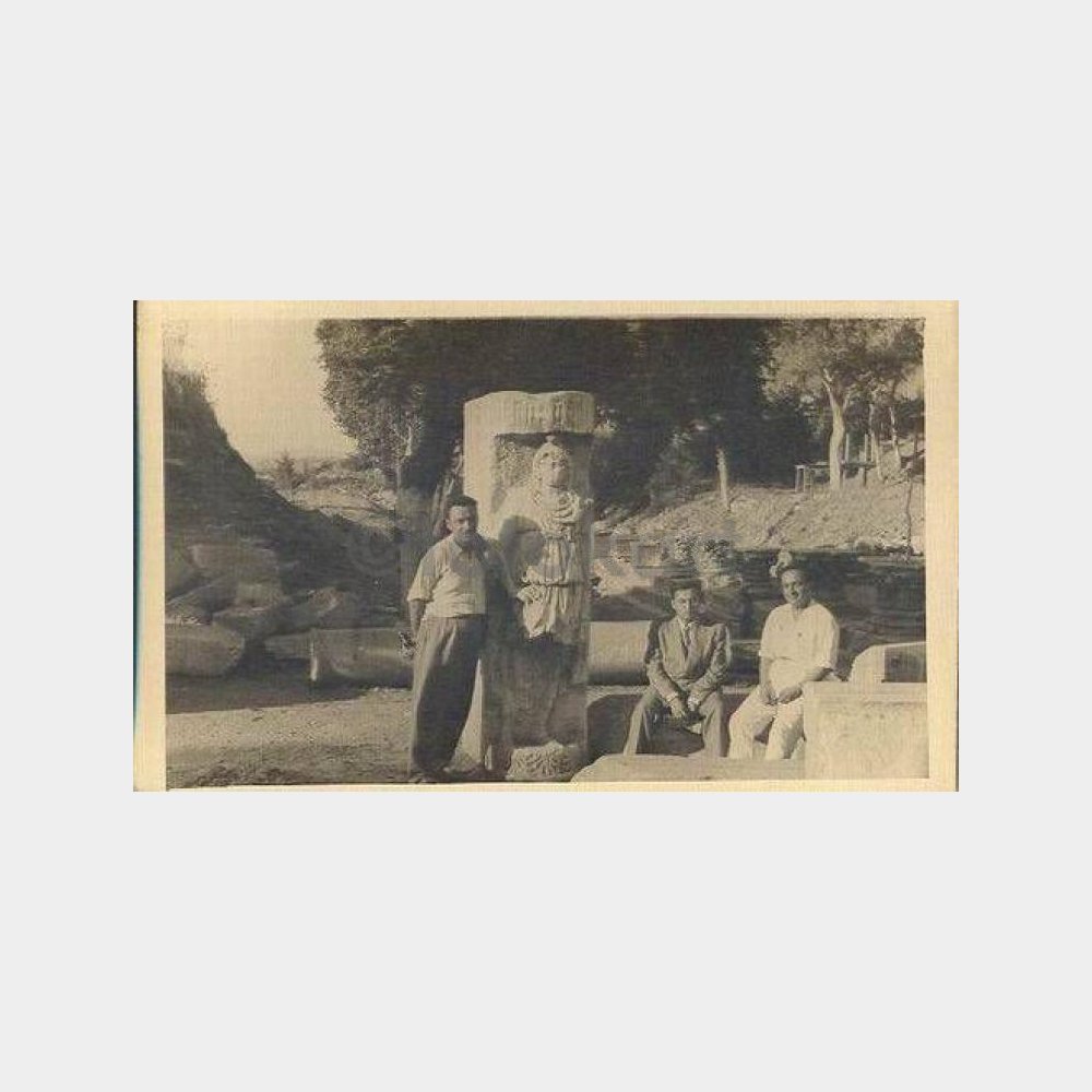 Tarihi eserler ve üç bay hatıra fotograf, arkası boş, iyi kondüsyonda.