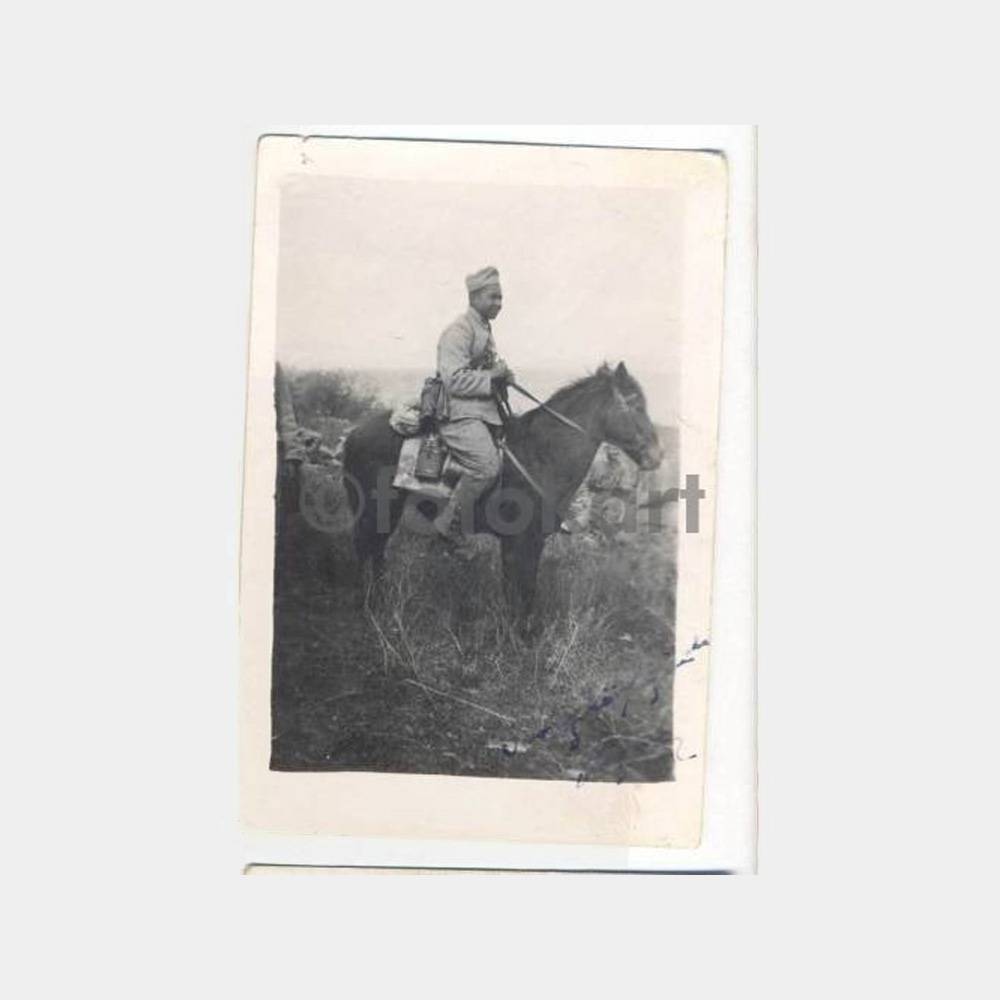 9,5 x 6,5 cm ebadında fotoğraf, arkası yazılı. At yerine katır olabilir, dürbünlü, esmer bir asker.