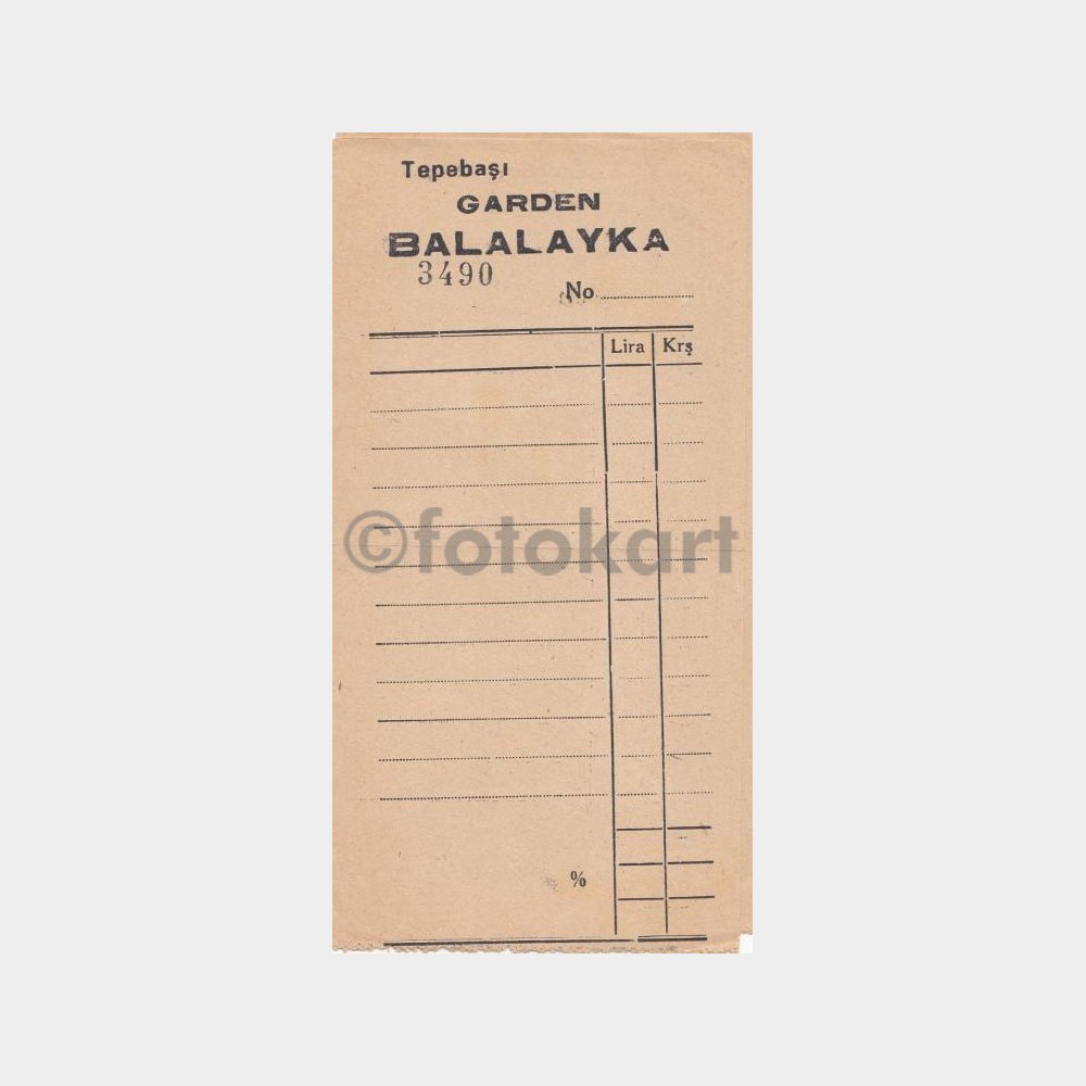 Eski Tepebaşı’nın ünlü birahanesi Garden Balalayka’nın 2 adet hesap fişi, boş durumda. 1930’lu yıllar, arkasında eski türkçe yazılar bulunmakta.